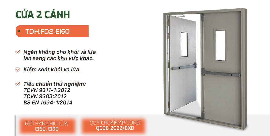 • Cửa thép 2 cánh chống cháy EI60 của TDH Door đạt tiêu chuẩn PCCC, chịu lửa trong 60 phút, giúp ngăn ngừa sự lan rộng của cháy và khói. Phù hợp lắp đặt tại các khu vực thoát hiểm, hành lang và các tòa nhà yêu cầu an toàn cháy nổ. Kiểm định đạt chuẩn, bảo vệ tối đa cho công trình.