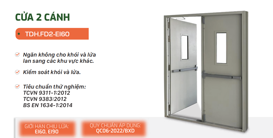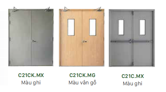 Cửa đi chống cháy đóng mở theo nguyên lý bản lề mở về môt hướng, cửa có cơ cấu đóng tự động bằng tay co thủy lực. Khả năng ngăn cháy có được do sử dụng lõi vật liệu chống cháy bông Cer-emic phủ keo chống cháy nâng cao khả năng chịu nhiệt theo tiêu chuẩn lên đến 60 phút. Khi đám cháy lan đến cửa các ron ngăn cháy sẽ trương nở chèn kín các ke hở ngăn khói và lửa xuyên qua cửa giảm thiểu rủi ro tổn thất thiệt hại về con ngươi và tài sản.